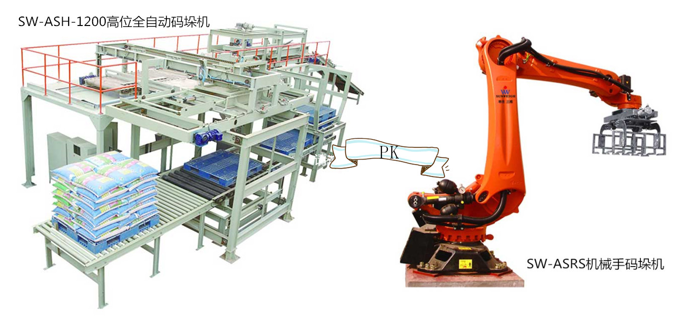 機械手碼垛機眾所周知有如人手一般的裝置,棗莊三維機械手碼垛機SW-ASRS主要由壓平整理、緩沖輸送機、抓取輥道、托盤機、機械手等裝置組成。整個碼垛的過程首先由輸送機將合格的包裝袋輸送到整平機進行壓袋整平,使袋形平整,包裝袋到達抓取輥道后機械手檢測到來袋的包裝袋對其進行抓取、轉向、堆放、分層進行碼放,從而完成整個碼垛工序。而它像人手一般的機械手裝置有一個缺點,如果來袋的包裝袋袋型不夠整齊會導致抓袋時將包裝袋抓破。因為機械手結構簡單安裝方便前期投入少、可同時碼垛不同規(guī)格型號的來料成品,也滿足3條輸送線來料的碼垛需求的特點,所以上市以來倍受眾多客戶的青睞。而棗莊三維不但有機械手這個結構小巧安裝簡單的碼垛機外,還有一款不會將包裝袋抓破的全自動碼垛機SW-ASH-1200高位全自動碼垛機,顧名思義高位碼垛機安裝高度相對機械手碼垛機來說要高出許多,而且高位全自動碼垛機只能碼垛一種規(guī)格一條輸送線來料的成品碼垛需求,而且相對機械手而言前期投入成本多出接近10倍,所以客戶一般都很少關注。但是高位碼垛機碼垛速度能達到1600包/小時,垛型整齊美觀牢固,是較傳統(tǒng)的人工碼垛效率高,這是機械手無法比擬的,而且所有包裝袋的袋口朝里,可實現(xiàn)自動編組分層。而機械手一般可碼垛800包/小時,雙手的可達到1000包/小時的碼垛速度;一般的機械手碼垛機可用6-8年,而高位全自動碼垛機可使用100年,使用壽命高出12倍還多;高位碼垛機可在任何地區(qū)使用,而機械手碼垛機不能在高原地區(qū)使用,多用于北方地區(qū);機械手碼垛機每年會產生1-3W的保養(yǎng)維護費,而這項費用高位碼垛機沒有,長期以往節(jié)省不少開支。
