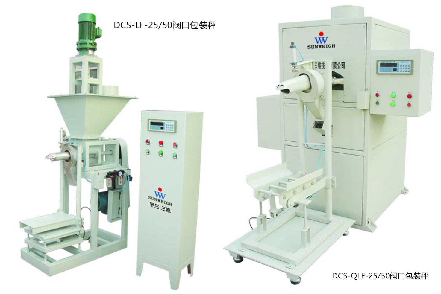 DCS-LF-25/50閥口包裝秤和DCS-QLF-25/50閥口包裝秤是棗莊三維生產(chǎn)的主打產(chǎn)品。閥口式定量包裝秤是集自動計量、灌裝、封包于一體,不需縫口機縫包的包裝機;并采用閥口式包裝工藝,減少了粉塵外溢;高速處理控制儀表及數(shù)字變頻技術,確保了極高的計量準確度。