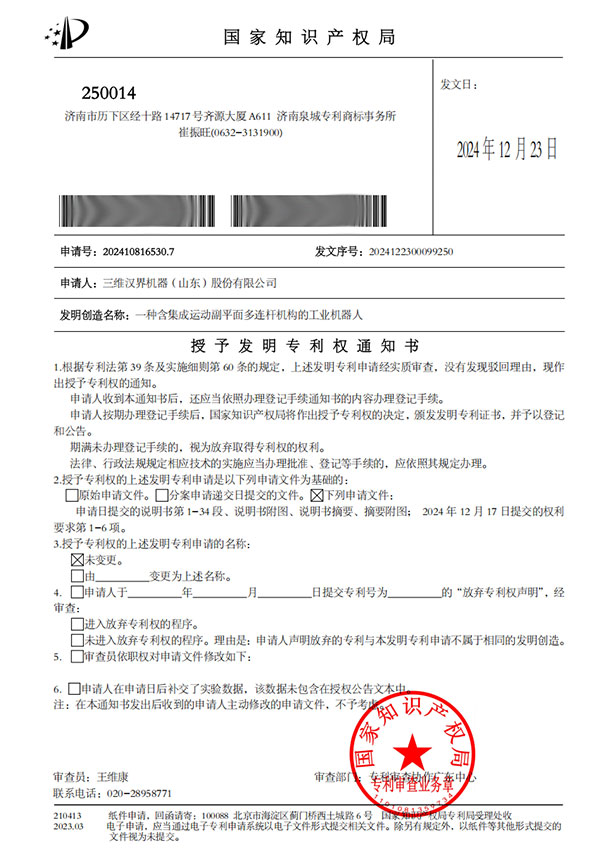 熱烈祝賀三維漢界機器(山東)股份有限公司首席科學(xué)家山顯雷教授親自主導(dǎo)研發(fā)的 “一種含集成運動副平面多連桿機構(gòu)的工業(yè)機器人” 成功獲得中國發(fā)明專利授權(quán)!